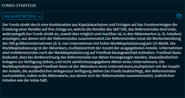 Im Compass-Widget "Fonds-Strategie" finden Sie für ETFs und Fonds die Beschreibung der Anlagestrategie.