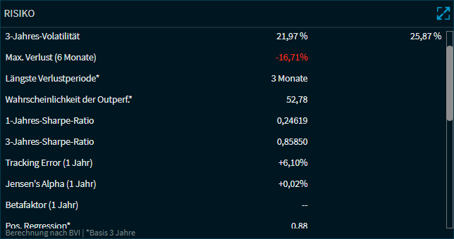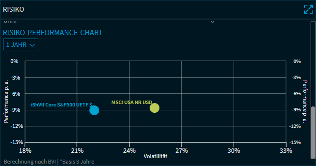 Im Compass-Widget "Risiko" finden Sie für ETFs und Fonds die wichtigsten Risikokennzahlen sowie darunter einen Risiko-Performance-Chart des Fonds und seiner Benchmark.