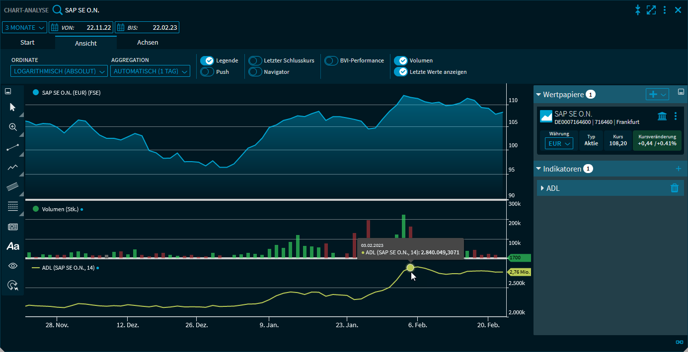 Die Accumulation/Distribution Line wird im Widget "Chart-Analyse" in einem neuen Chartfenster eingeblendet.