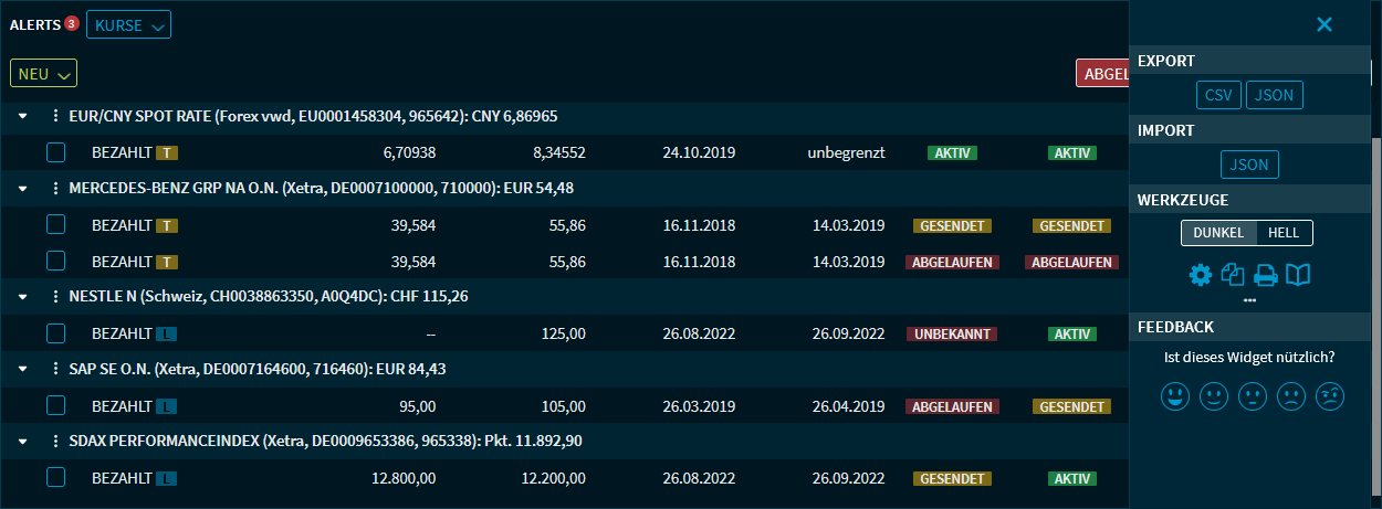 Neben der Möglichkeit, Alert-Daten als CSV-Datei zu exportieren, können Sie aktive Kurs-Alerts auch in ein spezielles JSON-Format zu exportieren. Ein Import dieser exportierten Daten ist anschließend möglich.
