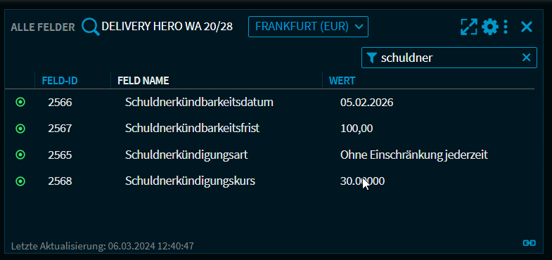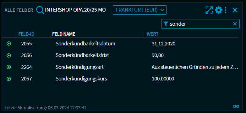 Im Widget "Alle Felder" stehen nun, wenn vorhanden, Informationen zu Kündigungsrechten von Anleihen zur Verfügung.