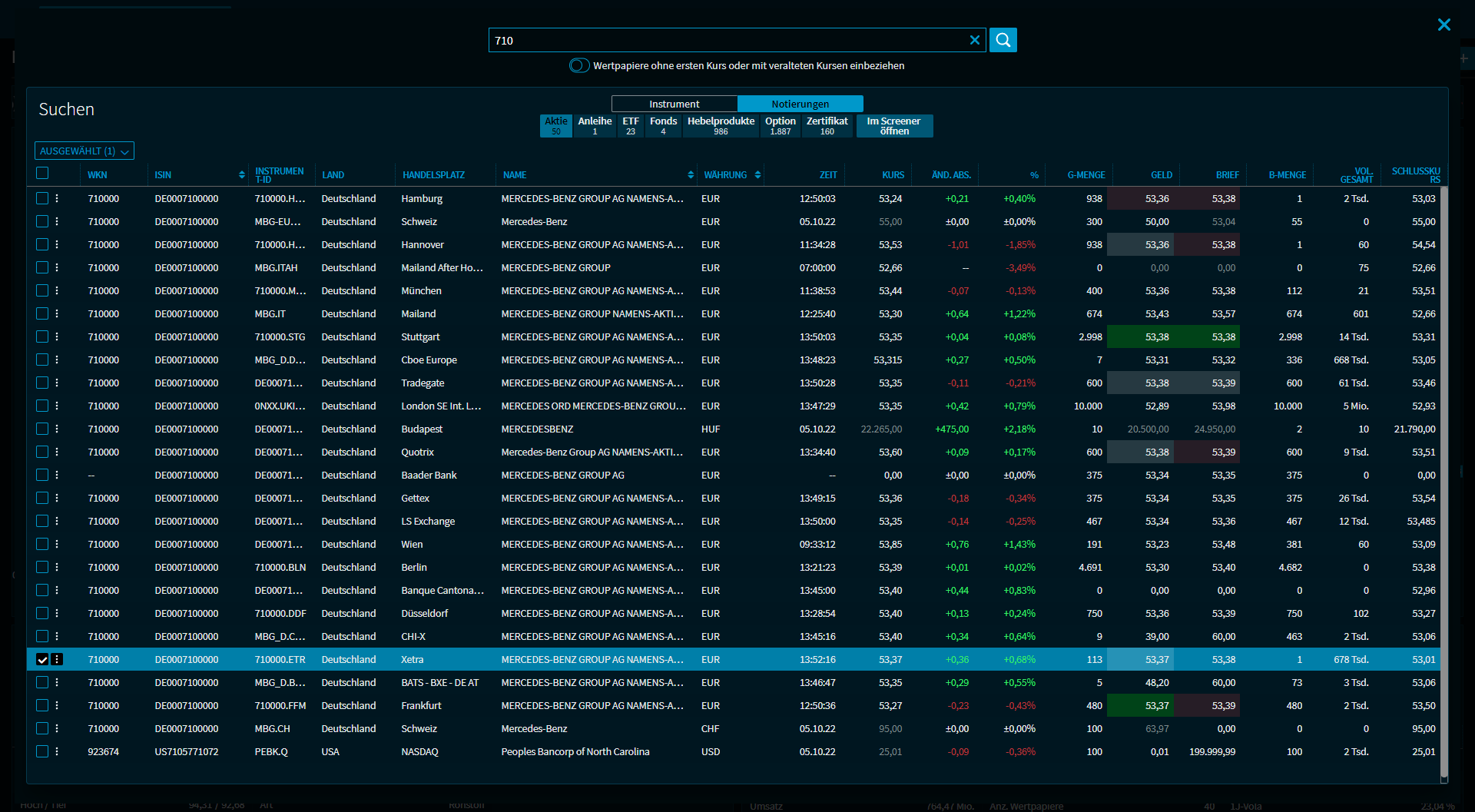 Über die Kontrollkästchen in der ersten Spalte können Sie auch mehrere Treffer auswählen und diese in einer Kursliste oder einem Portfolio Ihrer Wahl hinzufügen. Lesen Sie dazu den folgenden Abschnitt Mehrere Treffer im Suchergebnis auswählen.