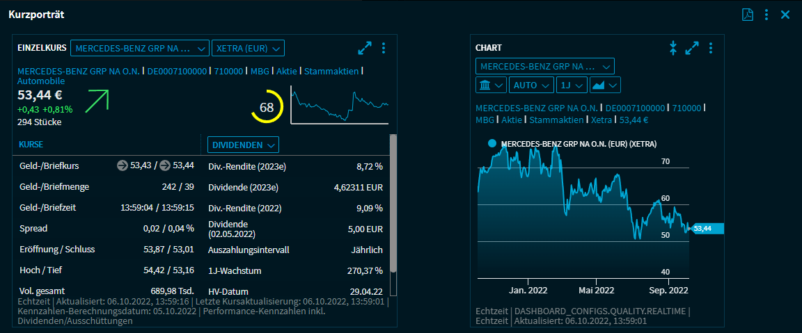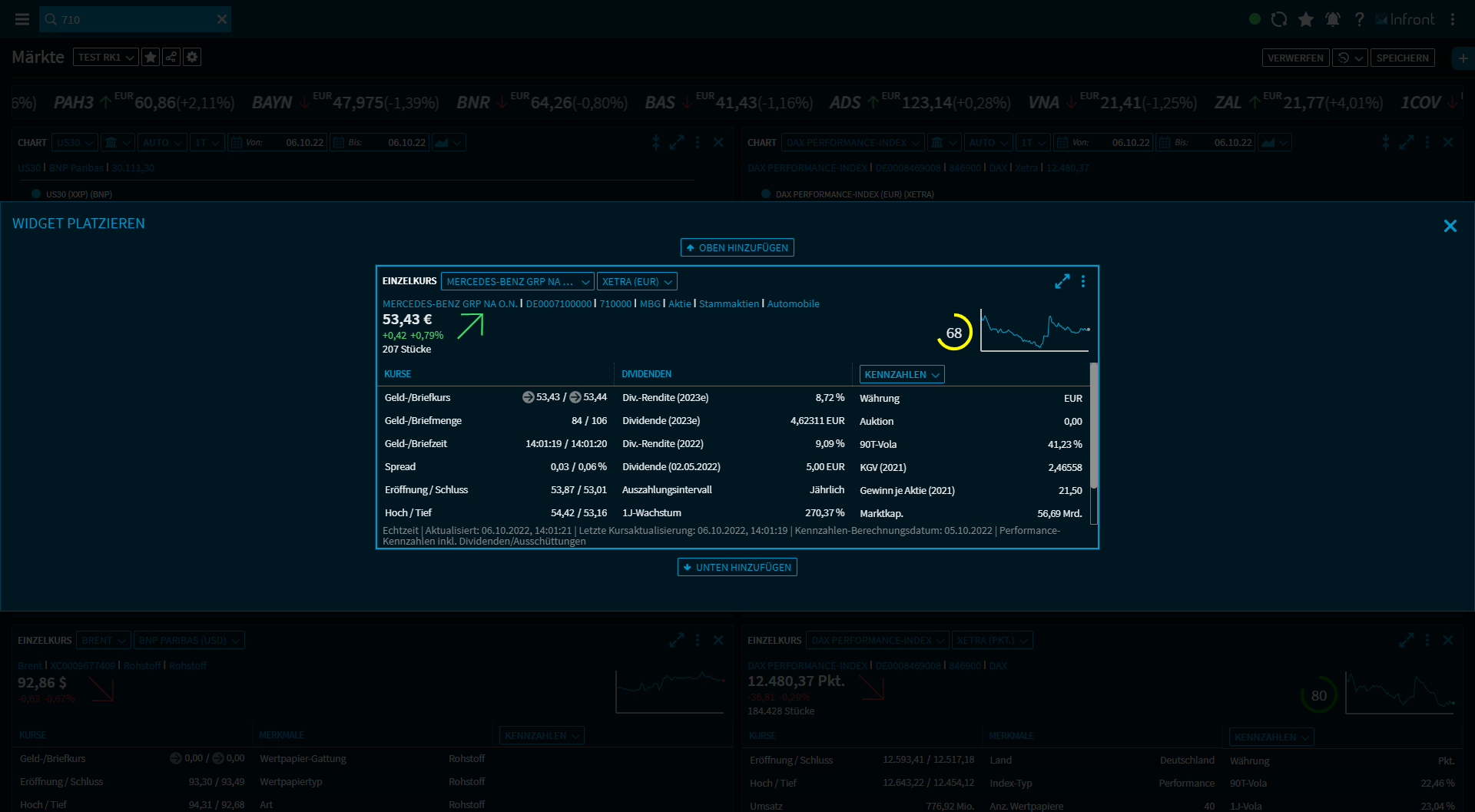 Das neue Widget - hier z. B. ein Widget "Einzelkurs" - wird dann an der gewünschten Stelle im Dashboard geöffnet. Per Mausklick ausgewählte Wertpapiere werden im Dashboard an der gewählten Stelle in einem Widget "Einzelkurs" geöffnet.