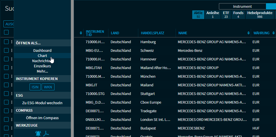 Über das Menü-Icon am Zeilenbeginn können Sie die Wertpapiere im Standard-Dashboard für diesen Wertpapiertyp öffnen. Auch die bekannten Befehle zum Öffnen in anderen Widgets (Chart, Nachrichten...) stehen zur Verfügung. Über das Alert-Icon unten im Bereich "Werkzeuge" wechseln Sie direkt in das Dialogfenster "Kurs-Alert". Auch stehen Befehle zum Öffnen des Wertpapiers in Compass oder ESG-Modul zur Verfügung.