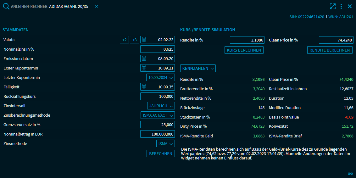 Der Anleihen-Rechner öffnet sich mit Standardwerten. Diese Werte werden auch dann vorgeblendet, wenn keine Anleihe ausgewählt ist ("Manuelle Berechnung") und somit ein wertpapierunabhängiges Szenario simuliert wird.