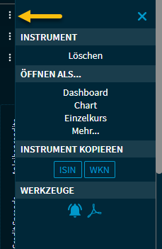 Icon "Menü" | Über das Menü-Icon links in jeder Zeile steht Ihnen das bekannte Menü zur Verfügung. Über dieses Menü können Sie aber auch die jeweilige Anleihe wieder aus dem Widget entfernen (Befehl "Löschen" im Bereich "Instrument"). |