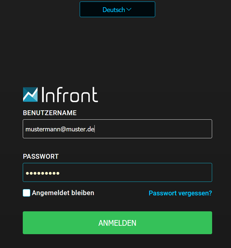 - Geben Sie in das erste Eingabefeld Ihren Benutzernamen oder Ihre der Infront Investment Manager bekannte E-Mail-Adresse ein.