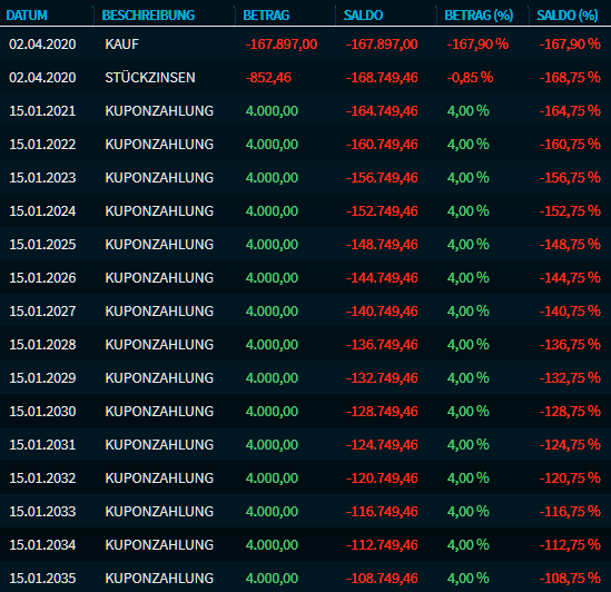 In der Ansicht "Cashflow", die Sie über den Button "Kennzahlen" auswählen, sehen Sie alle relevanten Zahlungsströme während der Haltedauer bzw. der Laufzeit der Anleihe.