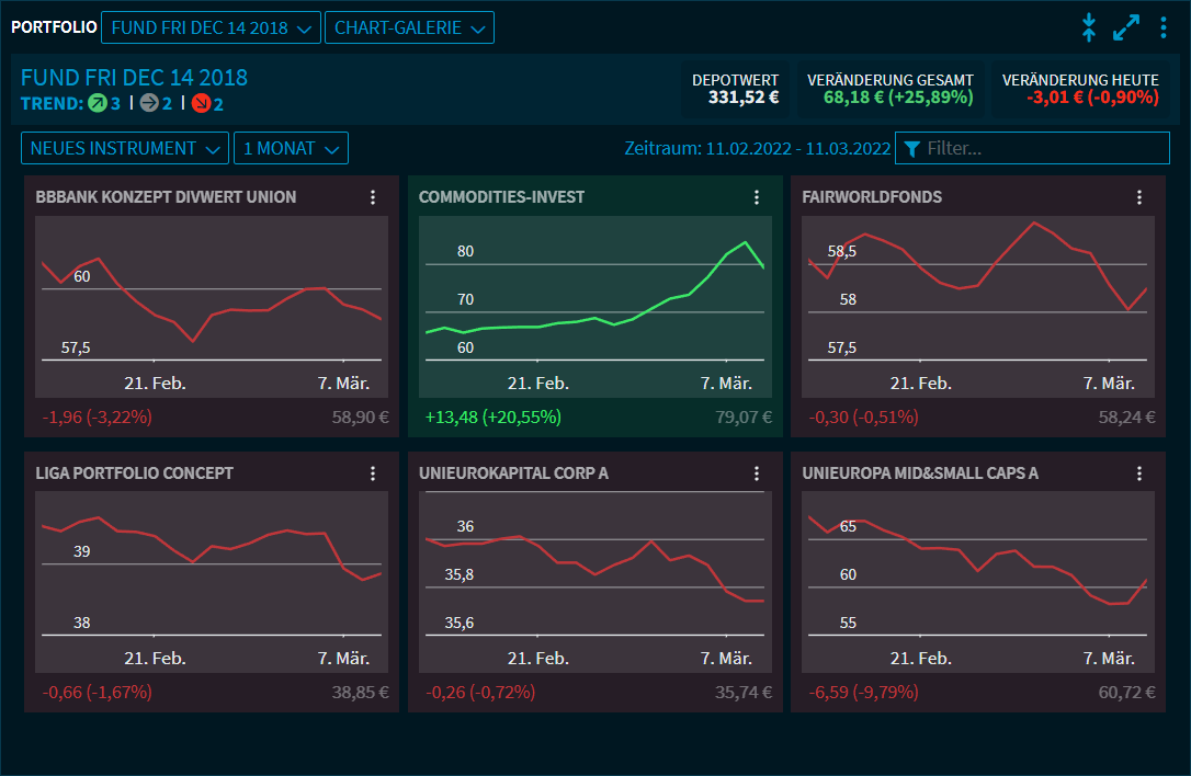 Wählen Sie in der Ansichtsauswahl die Ansicht "Chart-Galerie" aus, um die Wertpapiere im Portfolio als Einzelcharts in einer Chart-Galerie darzustellen.