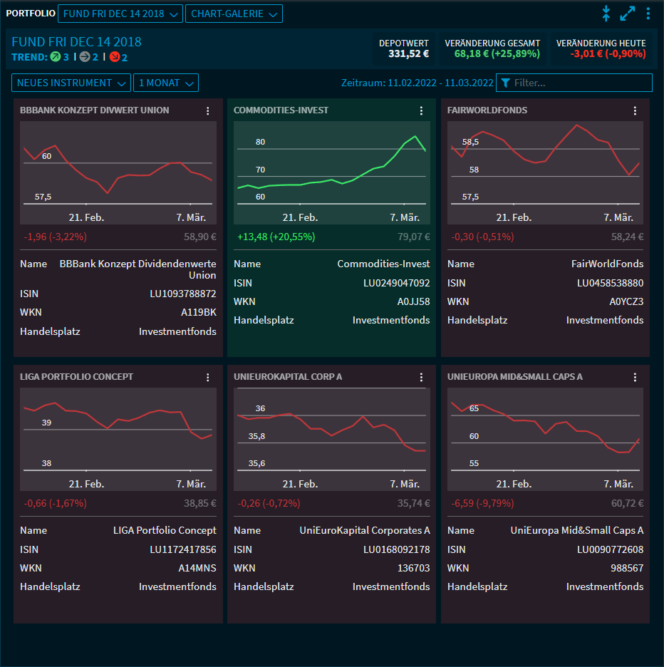 In der Chart-Galerie sehen Sie zu jedem Wertpapier des Portfolios den Chart inklusive Wertpapiername, Kurs und absoluter und prozentualer Kursentwicklung im Zeitraum. Charts von Wertpapieren mit positiver Kursentwicklung werden grün, solche mit negativer Kursentwicklung rot eingefärbt dargestellt.