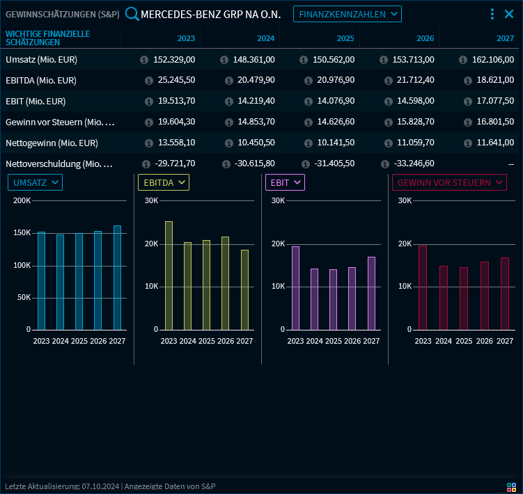 Hier sehen Sie im Bereich "Wichtige finanzielle Schätzungen" die Gewinnschätzungen des Unternehmens für 5 Jahre. Die Kennzahlen in der Tabelle werden darunter auch grafisch in Diagrammen dargestellt. Über den Diagrammen können Sie über die Auswahllisten alle Kennzahlen der Tabelle auswählen und anzeigen. Zeigen Sie mit der Maus auf die Säulen der Diagramme, um die zugehörigen Werte anzuzeigen.