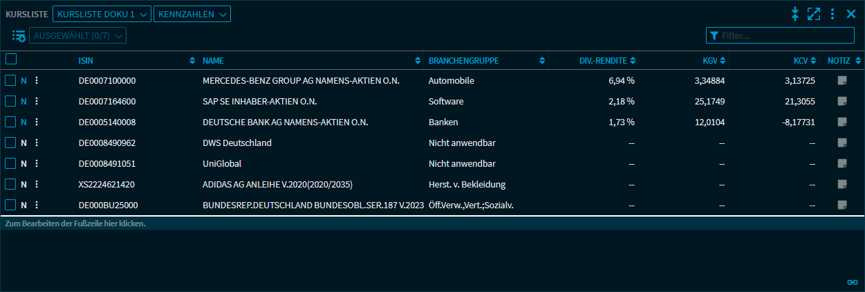 In der Ansicht "Kennzahlen" werden die Wertpapiere einer Kursliste bezüglich wichtiger Wertpapierkennzahlen analysiert. Der Aufbau der Tabelle entspricht der Ansicht "Übersicht".