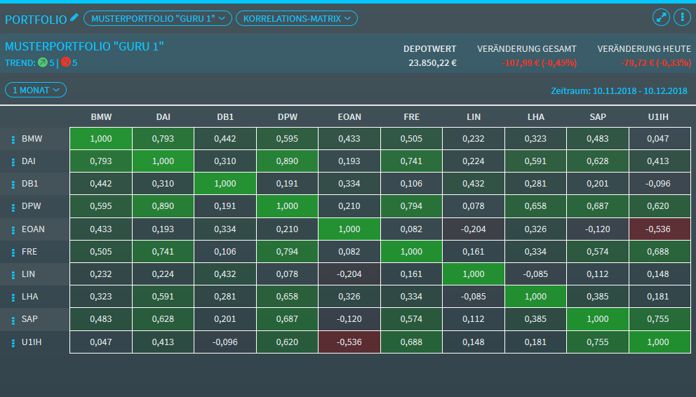Wählen Sie in der Ansichtsauswahl die Ansicht "Korrelations-Matrix" aus, um die Wertpapiere im Portfolio als Korrelations-Matrix darzustellen.