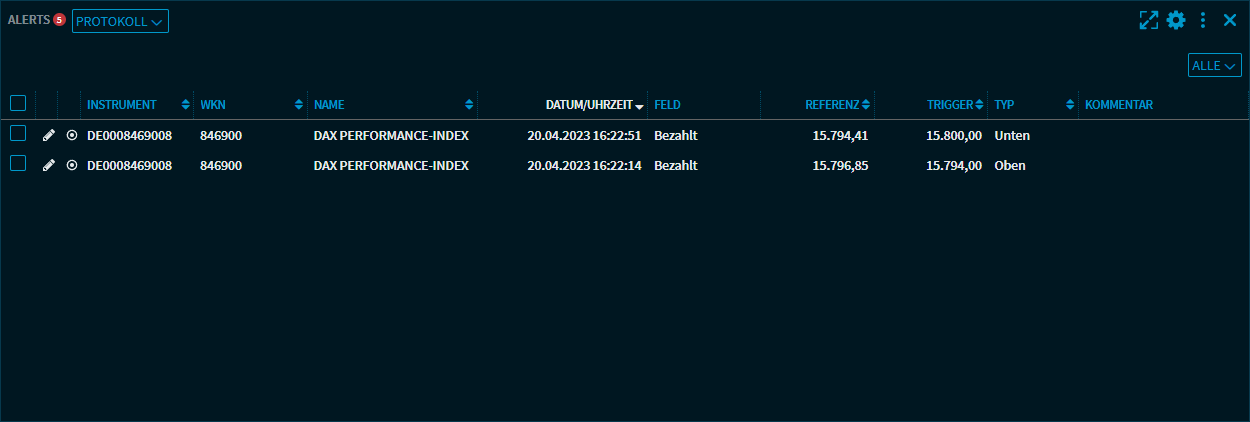 Spalte "Trigger" | Der Kurs des Wertpapiers, der den Alert ausgelöst hat (z. B. Limitdurchbruch). |