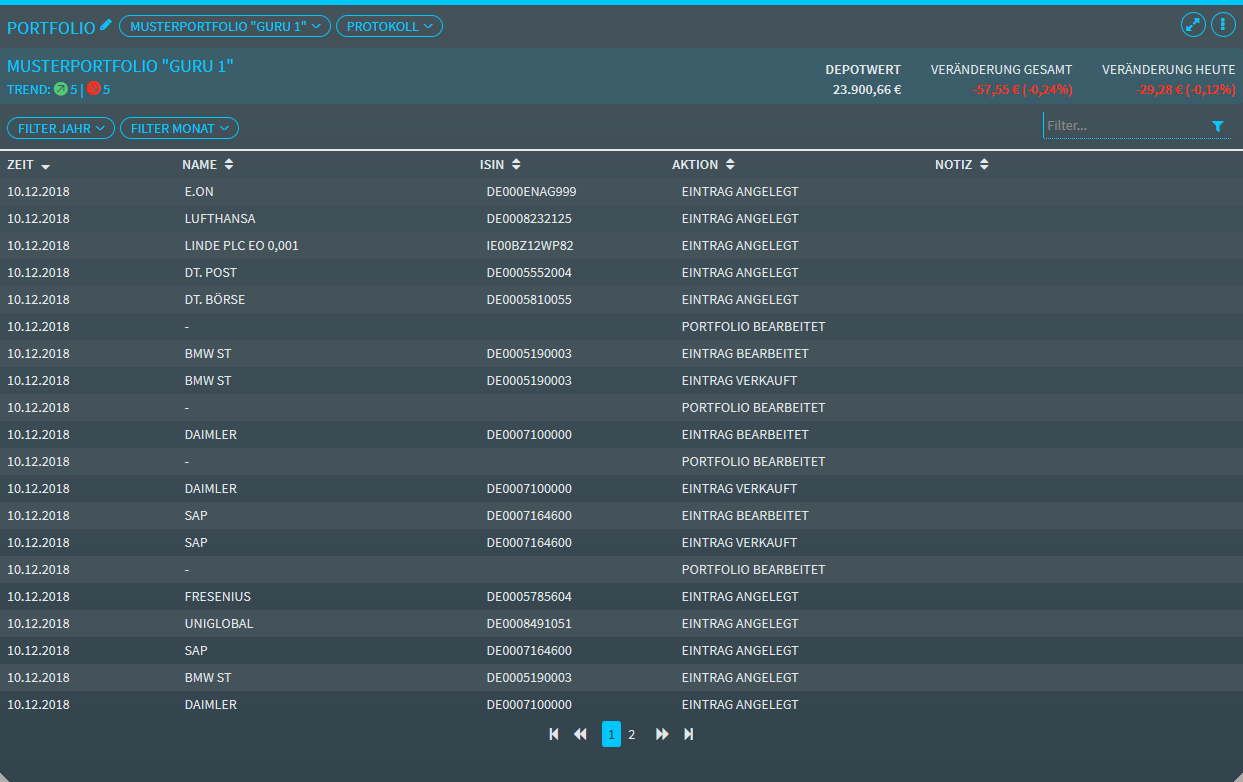 Wählen Sie in der Ansichtsauswahl die Ansicht "Protokoll" aus, um die Änderungen am Portfolio nachzuverfolgen. Im Protokoll werden alle Benutzeraktionen aufgelistet.