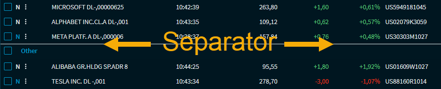 | Haben Sie eine einzelne Position der Kursliste ausgewählt, dann können Sie über dieses Icon einen Trenner über dieser Position einfügen. Um einen eingefügten Trenner wieder zu entfernen, markieren Sie die Position darunter erneut und wählen Sie dann dieses Icon.