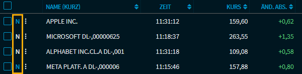 | Wählen Sie dieses Icon, um direkt die News zu dem jeweiligen Wertpapier in einem Nachrichten-Widget zu öffnen. Ist im Dashboard bereits ein Widget "Zugehörige Nachrichten" vorhanden, so werden die Nachrichten in diesem Widget angezeigt, ansonsten wird ein neues Widget "Zugehörige Nachrichten" unten im Dashboard geöffnet. Am Icon erkennen Sie direkt, ob für ein Wertpapier aktuelle Nachrichten verfügbar sind: In diesem Beispiel sind für die Wertpapiere "VOLKSWAGEN AG VZO O.N.", "DAIMLER AG NA O.N.", "DEUTSCHE BANK AG NA O.N." und "SAP SE O.N" Nachrichten verfügbar, für die anderen sichtbaren Wertpapiere nicht (Icon "Nachrichten" deaktiviert). |