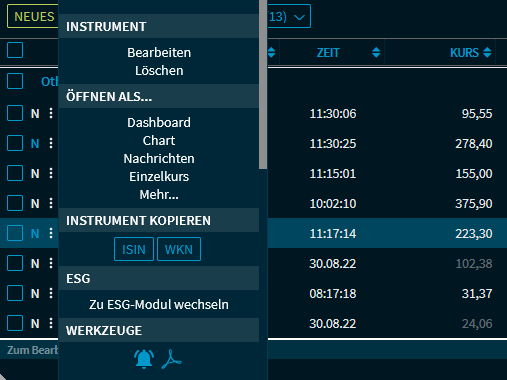 Wählen Sie in der Ansichtsauswahl die Ansicht "Übersicht" aus. In der Übersicht sehen Sie alle Wertpapiere der Kursliste in einer Tabelle. Für die einzelnen Positionen stehen Ihnen am Anfang der Zeilen verschiedene Funktionen und Befehle zur Verfügung.