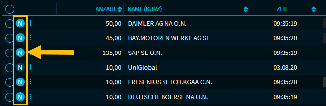 | Wählen Sie dieses Icon, um direkt die News zu dem jeweiligen Wertpapier in einem Nachrichten-Widget zu öffnen. Ist im Dashboard bereits ein Widget "Zugehörige Nachrichten" vorhanden, so werden die Nachrichten in diesem Widget angezeigt, ansonsten wird ein neues Widget "Zugehörige Nachrichten" unten im Dashboard geöffnet. Am Icon erkennen Sie direkt, ob für ein Wertpapier in Ihrem Portfolio aktuelle Nachrichten verfügbar sind. In diesem Beispiel sind für alle Aktien im Bildausschnitt Nachrichten verfügbar, für den Fonds "UniGlobal" keine. |