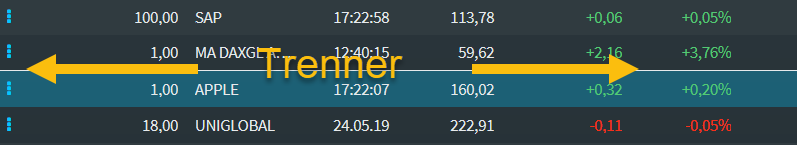 | Haben Sie eine einzelne Position des Portfolios ausgewählt, dann können Sie über dieses Icon einen Trenner über dieser Position einfügen. Um einen eingefügten Trenner wieder zu entfernen, markieren Sie die Position darunter erneut und wählen Sie dann dieses Icon.