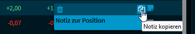 Lesen Sie zum Ein- und Ausblenden der Spalten ggf. den Abschnitt Einstellungen Widget "Portfolio". Wie in anderen Tabellen können Sie auch die Positionsübersicht per Mausklick auf eine Spaltenüberschrift neu sortieren. Lesen Sie dazu ggf. auch den Abschnitt Tabellen in Widgets sortieren. Per Drag & Drop können Sie auch eine einzelne Position der Positionsübersicht jederzeit an eine neue Stelle verschieben. Neben diesen Standardspalten für die Positionsübersicht können Sie aus dem Widget "Alle Felder" auch beliebige weitere Spalten hinzufügen. Lesen Sie dazu den Abschnitt Felder aus dem Widget "Alle Felder" zu Tabellen in Widgets hinzufügen. Für einige Werte in den Spalten werden aus Übersichtlichkeitsgründen (nur) zwei Nachkommastellen dargestellt, z. B. die Spalten "Veränderung heute", "Veränderung gesamt", "Kurswert". Zeigen Sie auf diese Spalten, dann werden die exakten Werte angezeigt. |