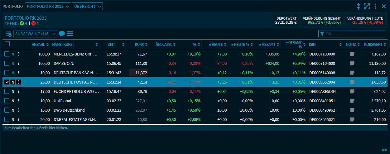 Wählen Sie in der Ansichtsauswahl die Ansicht "Übersicht" aus. In der Positionsübersicht sehen Sie alle Portfoliopositionen in einer Tabelle. Für die einzelnen Positionen stehen Ihnen am Anfang der Zeilen verschiedene Funktionen und Befehle zur Verfügung.