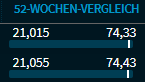52-Wochen-Vergleich | Der Vergleich des aktuellen Kurses im Verhältnis zu High und Low der letzten 52 Wochen. ![]() Der senkrechte Balken in der Grafik symbolisiert den aktuellen Kurs an diesem Platz, im Beispiel liegt dieser an beiden Plätzen nahe beim 52-Wochen-Hoch. |