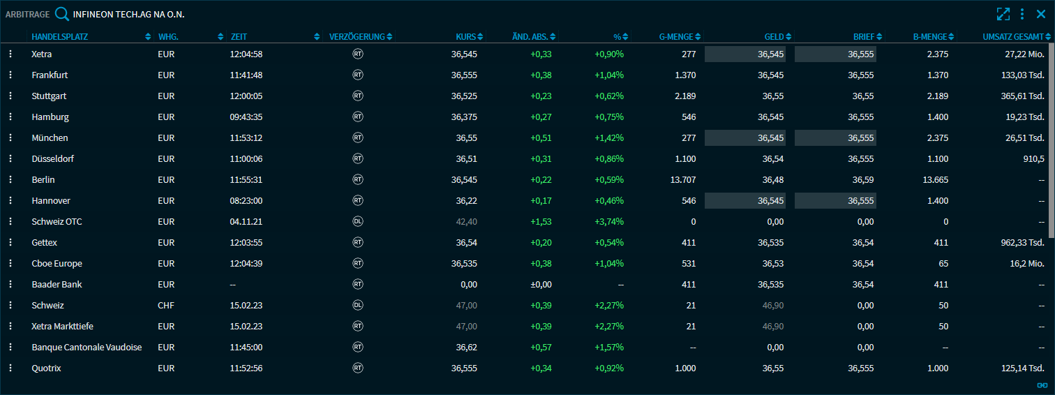 Das Widget "Arbitrage" listet für eine Aktie die aktuellen Kurse aller verfügbaren Handelsplätze in einer Tabelle auf. So können Sie auf übersichtliche Weise sofort Möglichkeiten zur Arbitrage auf den globalen Handelsplätzen erkennen.