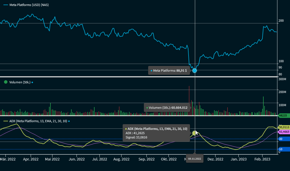 Der von Welles Wilder entwickelte Average Directional Index (ADX) gehört zum umfassenden "Directional-Movement-Indicator-Konzept (DMI-Konzept)". Der ADX, auch bekannt als Average Directional Movement Index, ist darauf ausgelegt, Trendstärken zu bestimmen. Der ADX wird in einem separaten Chartdiagramm angezeigt.
