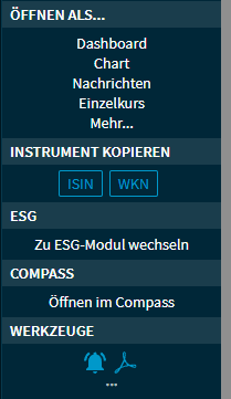 | Instrument kopieren | Hier können Sie wahlweise WKN oder ISIN des aktuellen Wertpapiers in die Zwischenablage kopieren. |