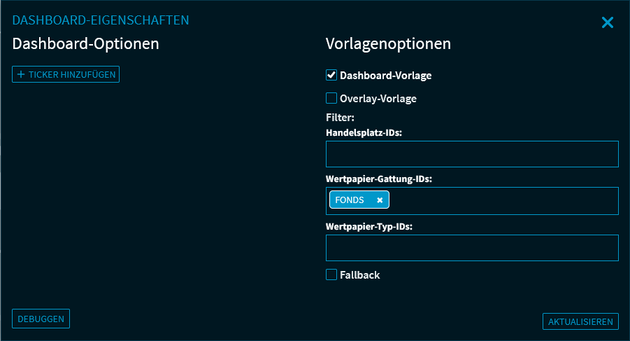 Legen Sie nun im erscheinenden Dialogfenster "Dashboard-Eigenschaften" die gewünschten Vorlagenoptionen fest, z. B. Wertpapier-Gattung-IDs "Fonds".