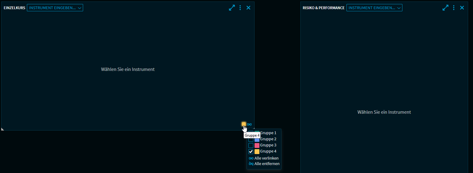Öffnen Sie die Widget-Galerie und platzieren Sie z. B. die Widgets "Einzelkurs" und "Risiko & Performance" auf dem Dashboard.