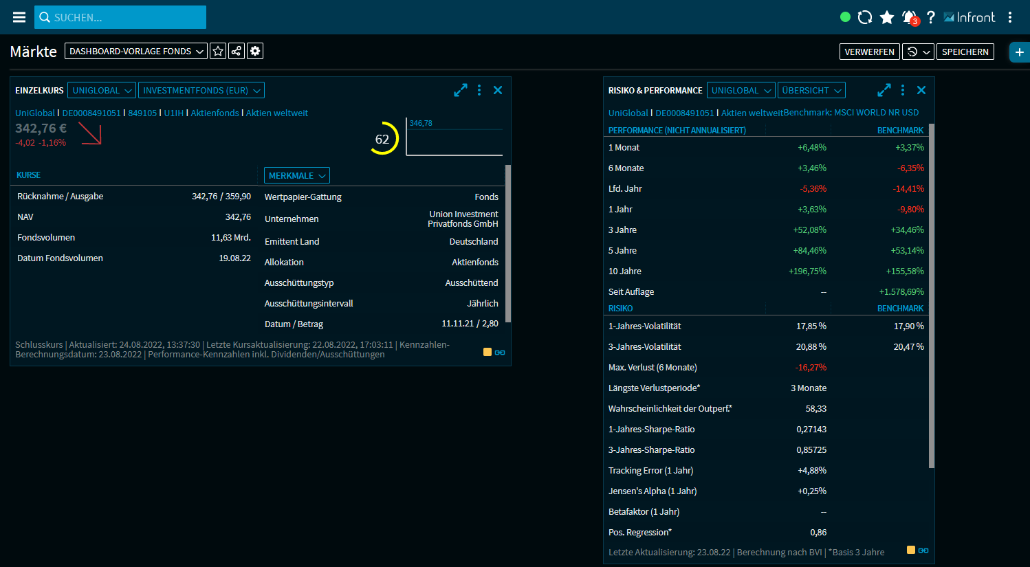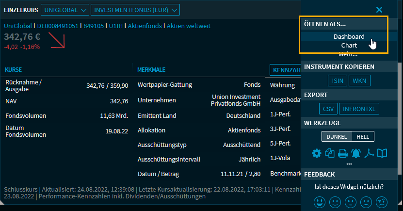 Öffnen Sie nun ein anderes Dashboard oder den Screener und wählen Sie im Widget-Menü eines Fonds den Befehl "Öffnen als Dashboard". Der ausgewählte Fonds wird in der zuvor angelegten Dashboard-Vorlage geöffnet: