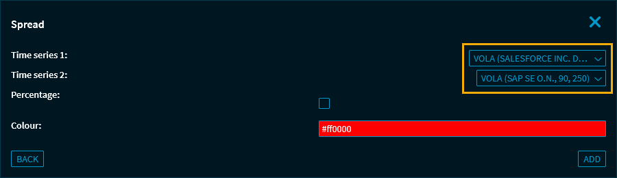 - Fügen Sie dann den Indikator "Spread" hinzu. Wählen Sie für den Parameter "Zeitreihe 1" die erste Vola und für den Parameter "Zeitreihe 2" die zweite Vola und bestätigen Sie die Auswahl mit dem Button "Speichern".