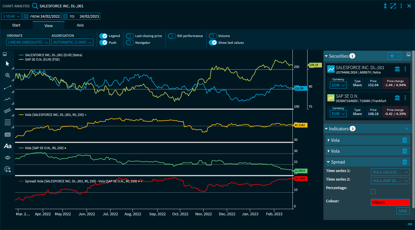 - Fügen Sie für die beiden Wertpapiere jeweils den Indikator "Volatilität" hinzu.