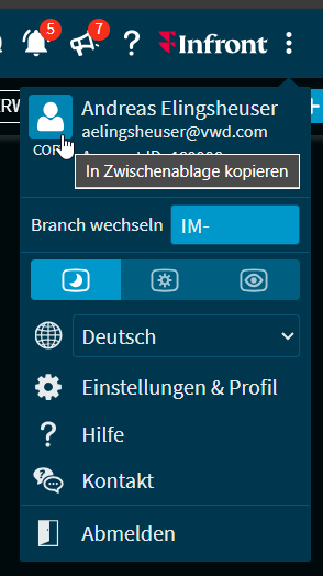 Im Einstellungsmenü auf der rechten Seite besteht die Möglichkeit, Benutzerinformationen (Name, E-Mail, Login, Institut, Basis-Produkt, Realm und Account-ID) in die Zwischenablage zu kopieren, um sie zum Beispiel in Tickets zu kopieren.