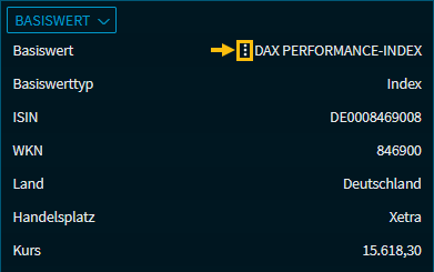 | Basiswert | Der Basiswert (Underlying) des Derivats. Über das Menü-Icon vor dem Basiswert öffnen Sie wie gewohnt ein Kontextmenü, über das Sie z. B. den Basiswert als Einzelkurs oder Chart öffnen können: