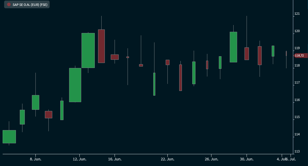 Diese Farben sind die bekannten Standardeinstellungen für Candlestick- und Candlevolume-Charts. Sie können diese Kerzenfarben im Widget "Chart-Analyse" individuell ändern.