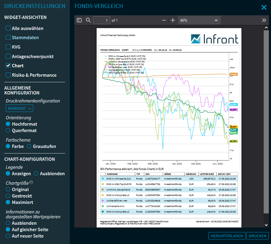 Beim Drucken von Charts finden Sie neben den im Abschnitt Widgets drucken beschriebenen Einstellungsmöglichkeiten viele weitere Optionen.
