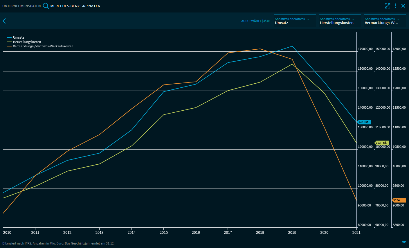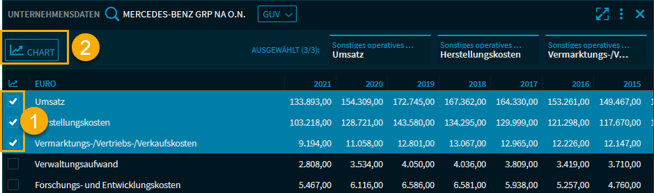 Über die Auswahlfelder auf der linken Seite jeder Tabelle im Widget "Unternehmensdaten" können Sie bis zu 3 verschiedene Kennzahlen auswählen. Haben Sie mindestens einen Eintrag markiert, können Sie über den dann im Header des Widgets sichtbaren Button "Chart" eine grafische Darstellung der markierten Kennzahlen anzeigen.