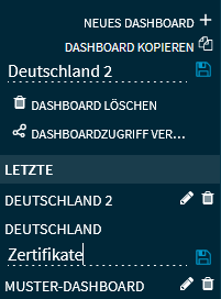 Möchten Sie eines der privaten Dashboards umbenennen, dann wählen Sie das Icon "Bearbeiten" dieses Dashboards und überschreiben Sie dann im Eingabefeld die aktuelle Dashboardbezeichnung. Wählen Sie danach das nun sichtbare Icon "Speichern" rechts neben der Bezeichnung.