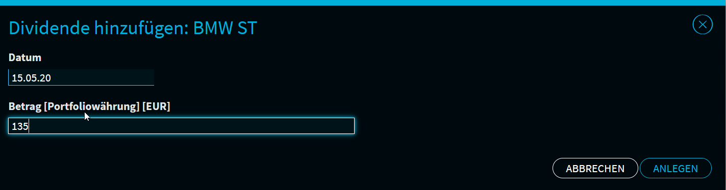 Um für eine bestehende Position Ihres Portfolios eine Dividende zu erfassen, gehen Sie wie folgt vor: