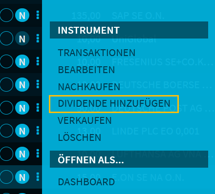 Öffnen Sie in der Positionsübersicht über das Menü-Icon in der Zeile mit der Position das Menü und wählen Sie dort den Befehl DIVIDENDE HINZUFÜGEN.