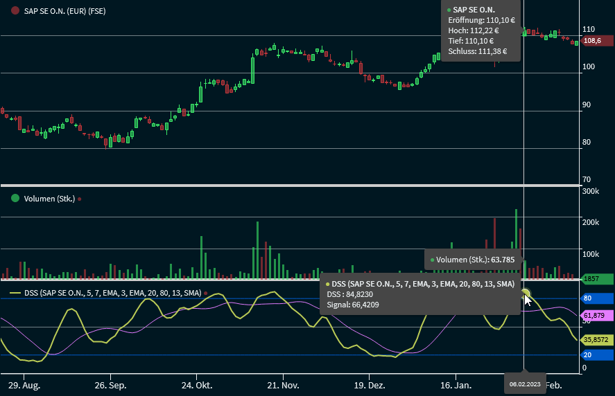 - Der Markt gilt als "überkauft", wenn der DSS über die 70%-Linie steigt.