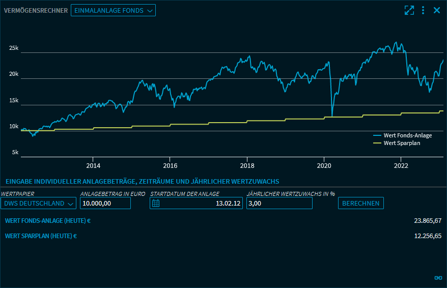 Wählen Sie oben im Widget "Vermögensrechner" das Szenario "Einmalanlage Fonds" und wählen Sie dann den Fonds bzw. ETF unten in der ersten Auswahlliste "Wertpapier" über die integrierte Schnellsuche aus. Geben Sie dann Ihre Daten ein. Die Berechnung in diesem Szenario erlaubt die Betrachtung einer einmaligen Einlage für einen ETF/Fonds auf Basis der historischen Fondsperformance. Zum Vergleich wird eine Einmalanlage zu einem festen Zinssatz dargestellt.
