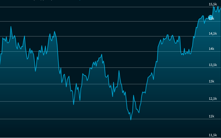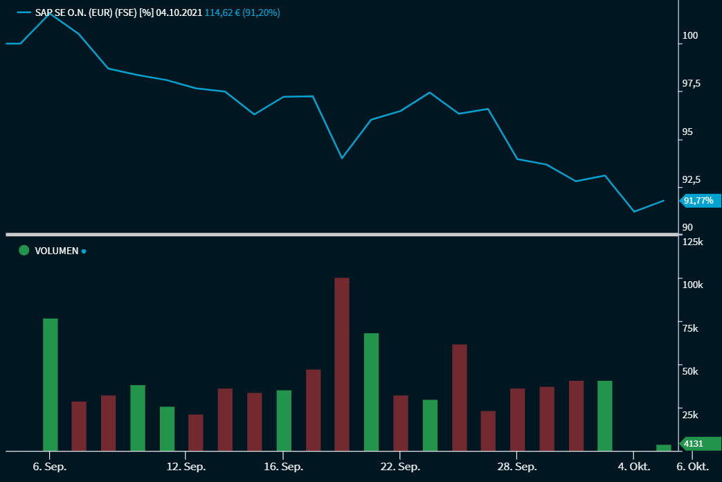 | Volumen | Legen Sie diesen Schalter nach rechts, um die Umsätze einzublenden. Dieser Indikator zeigt die Umsätze zu den jeweiligen Zeitpunkten als Balken eines Histogramms an. Dabei werden Umsätze bei steigenden Kursen grün und Umsätze bei fallenden Kursen rot angezeigt. Beispiel: Chart mit eingeblendetem Volumen