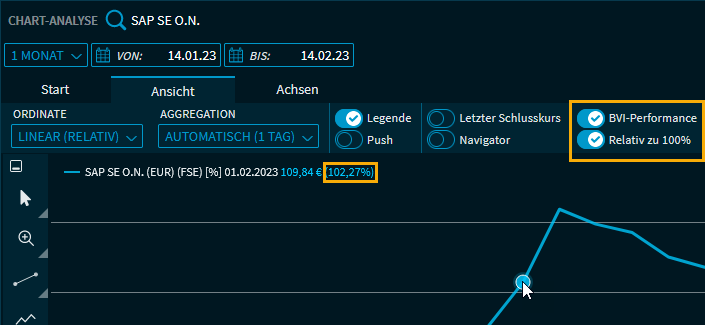 | BVI-Performance | Legen Sie diesen Schalter nach rechts, um die Darstellung im Chartfenster auf BVI-Performance umzustellen. Ist diese Einstellung aktiviert, dann erscheint darunter ein weiterer Schalter, über den Sie einstellen können, ob die Ursprungslinie der Performancedarstellung bei 100 oder bei 0 liegt. Die Anzeige der BVI-Performance erscheint - je nach gewählter Einstellung - hinter dem entsprechenden Legendeneintrag oder direkt im Tooltip am Mauszeiger.