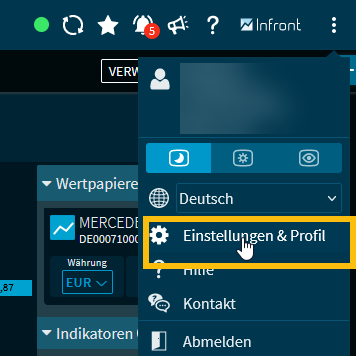 Im Infront Investment Manager haben Sie jederzeit die Möglichkeit, Ihre aktuellen Profil- und Programm-Einstellungen einzusehen und zu bearbeiten. Verwalten Sie so Ihre bei Infront gespeicherten persönlichen Informationen. Der hier eingegebene Name wird z. B. verwendet, um Dashboards mit anderen Benutzern zu teilen und Nachrichten zu verschicken.