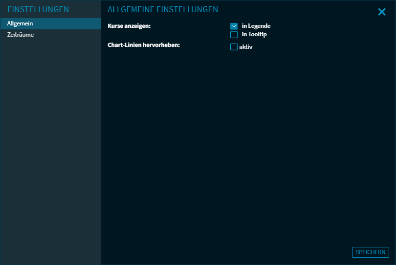 Kurse anzeigen | Hier können Sie auswählen, ob Sie beim Zeigen auf die Chartlinien die Kursanzeige in der Legende (Standardeinstellung) oder als Tooltip direkt am Mauszeiger einblenden möchten. Aktivieren Sie dazu das gewünschte Kontrollkästchen. |