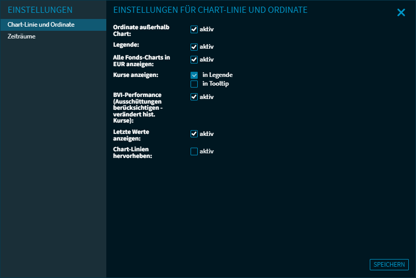 Konfigurieren Sie hier Ihren Chart im Widget "Fonds-Vergleich". Die vielfältigen Einstellungsmöglichkeiten sind übersichtlich in Bereiche gruppiert, die Sie auf der linken Seite auswählen können: